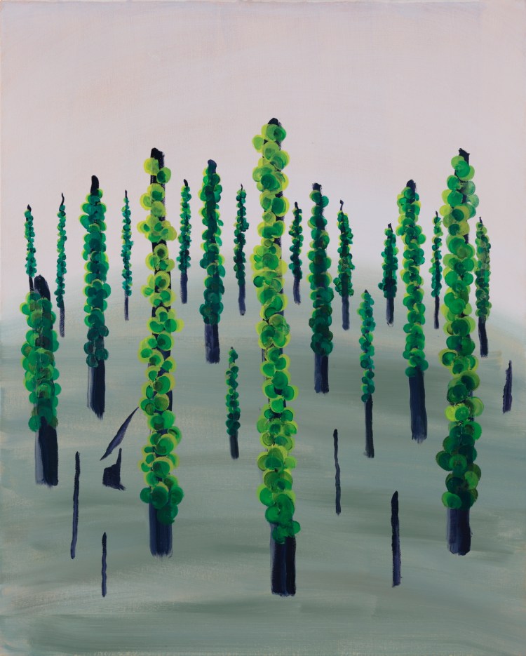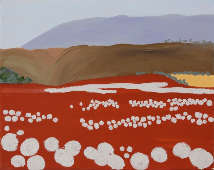 This one was a thought bubble. My vision for this work included a spattering of trees across the canvas, however I had shamefully managed to splash a few pinhead sized blue dots onto my red dirt. They were annoying the hell out of my so I painted the first trees on the pinhead dots, stepped back to have a look and decided I was done; no more trees required